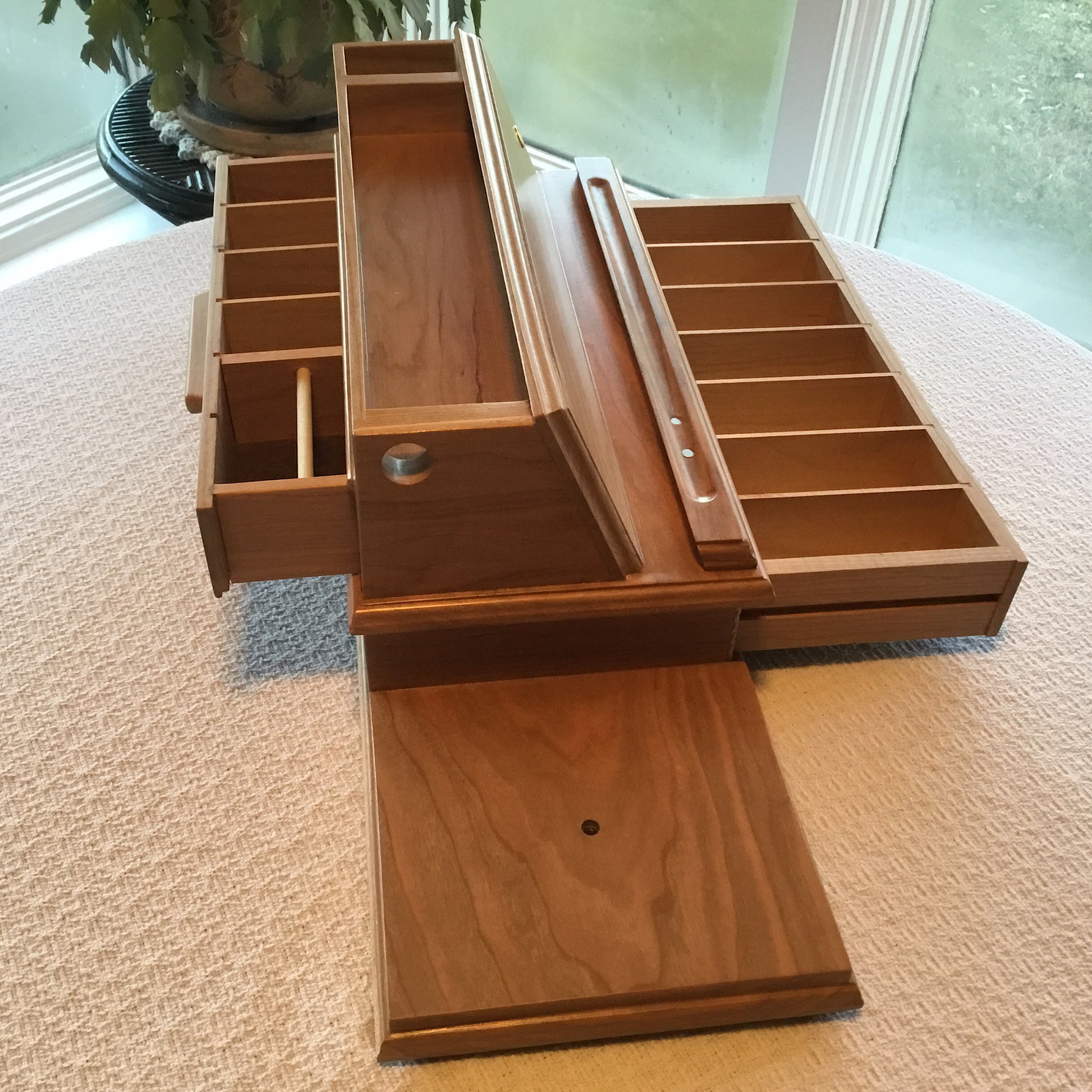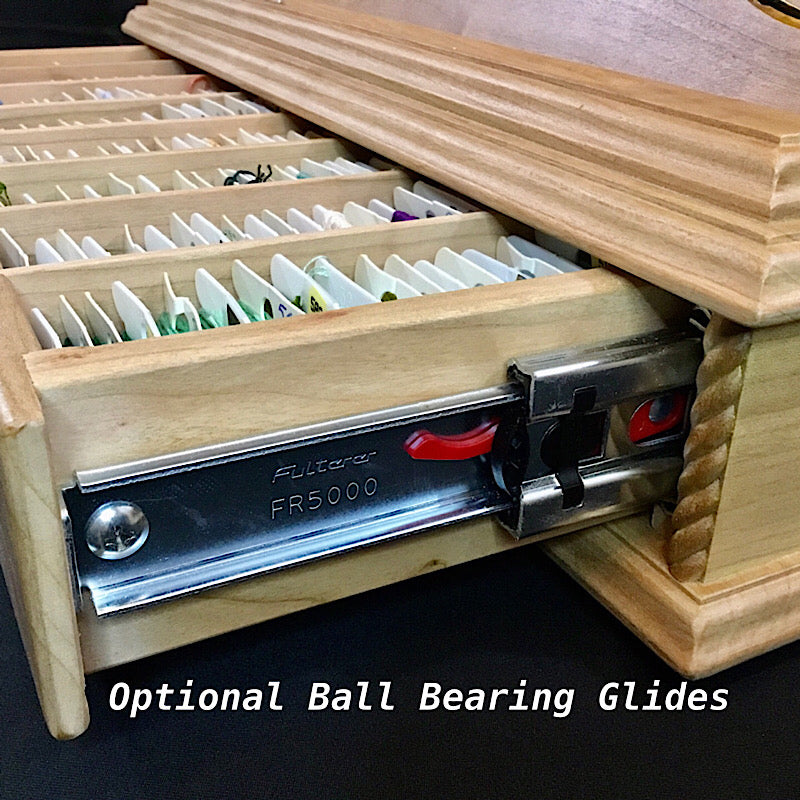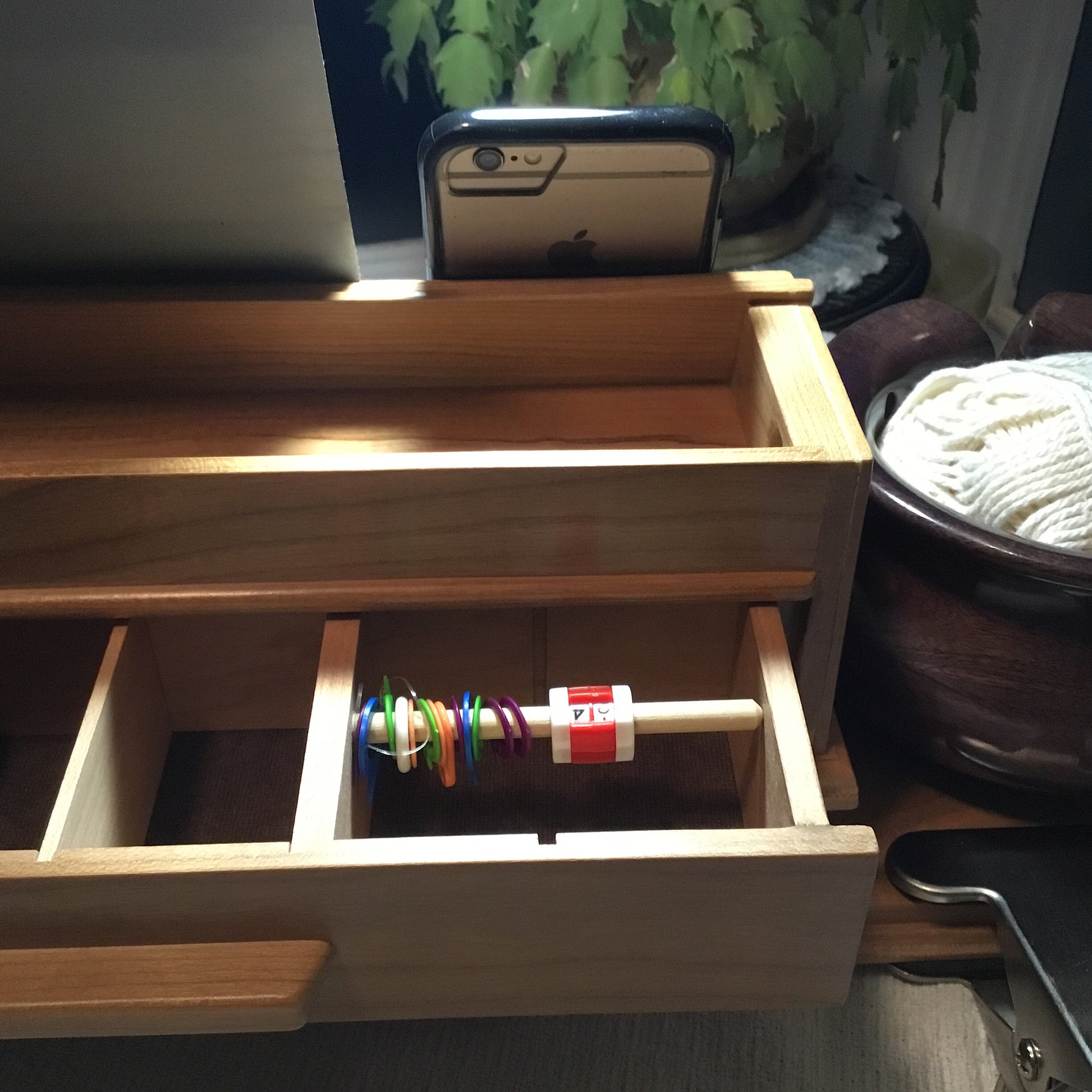 Removable holder with rod located inside of rear drawer for holding stitch markers.