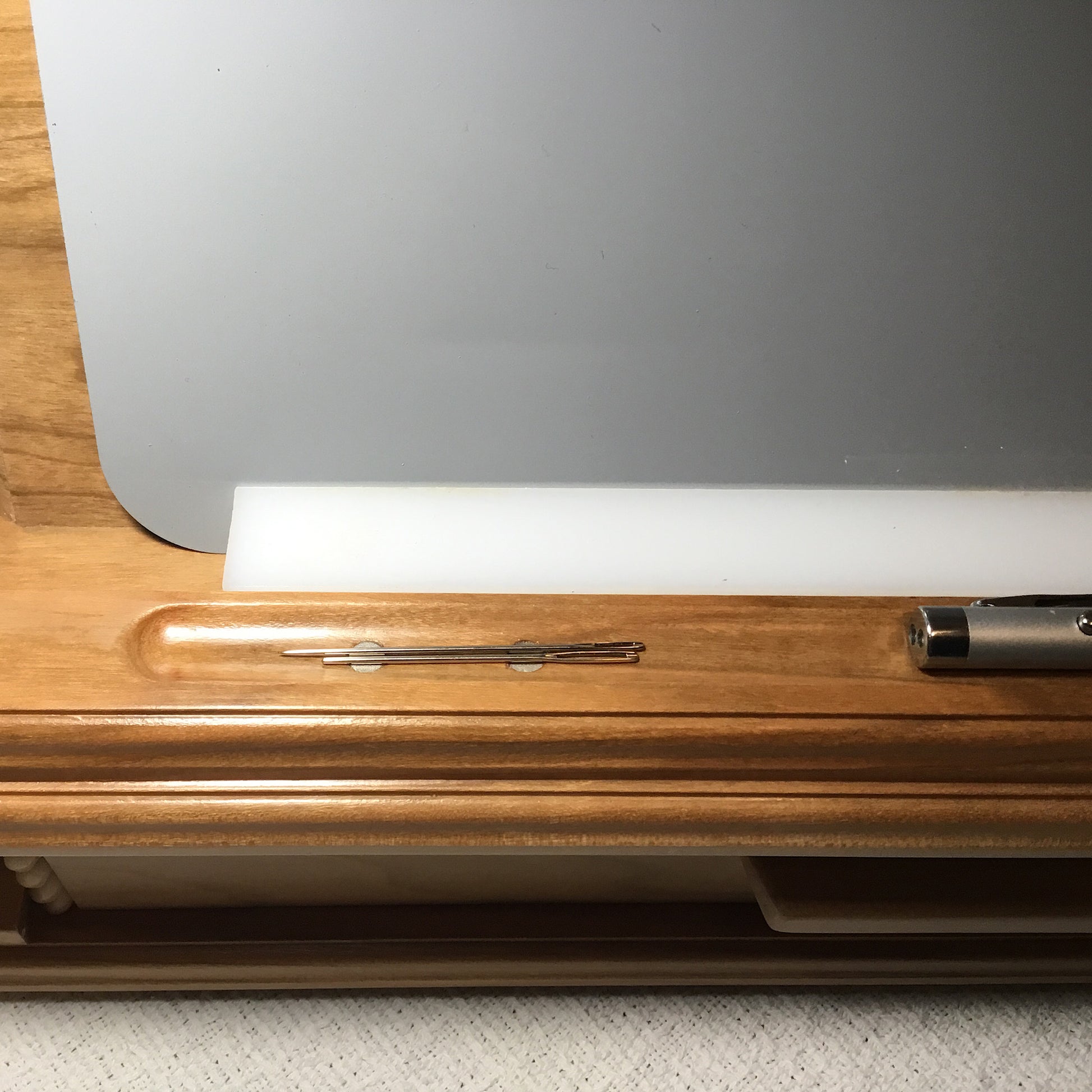 Magnets are imbedded in the pen/ pencil holder to secure metal sewing needles.