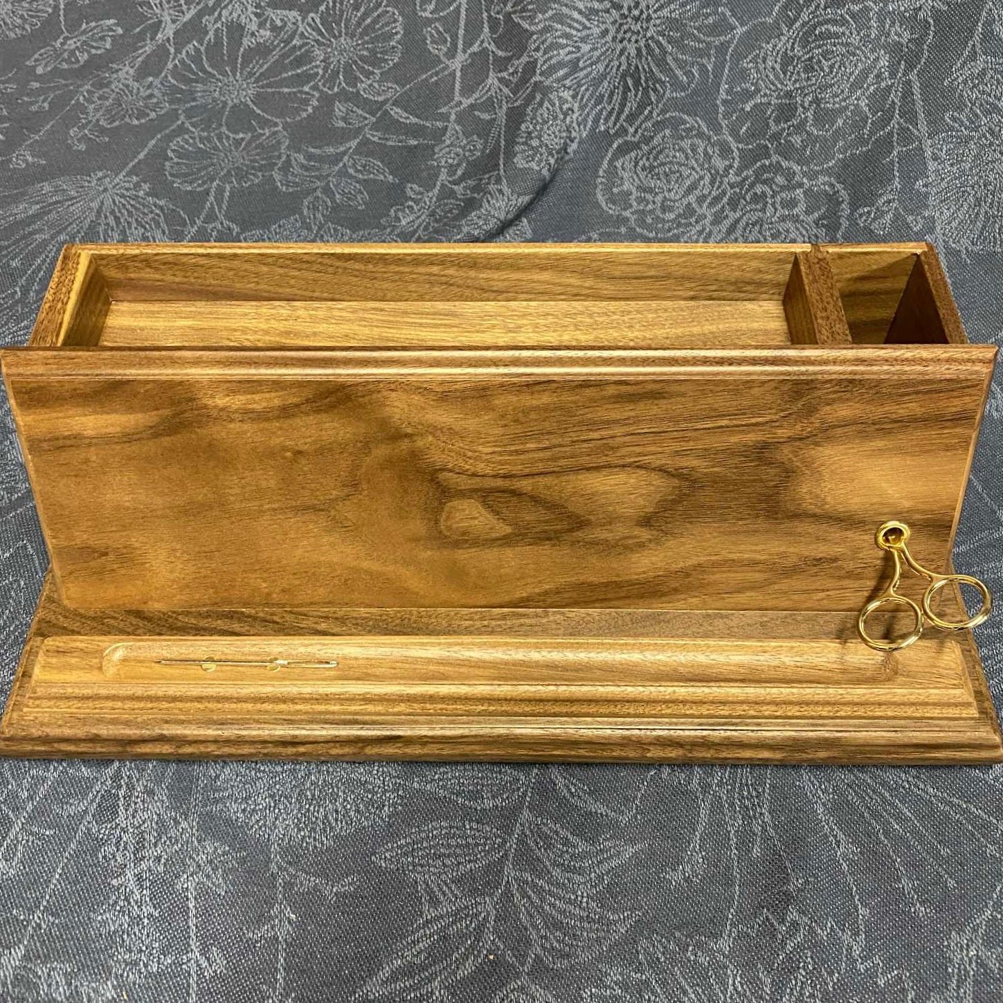 The front recess offers a place to set a pencil and sewing needle held by magnets.