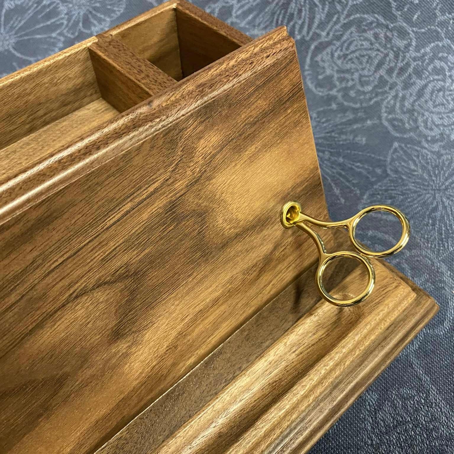 Magnets are embedded in the pen/ pencil holder to secure metal sewing needles.
